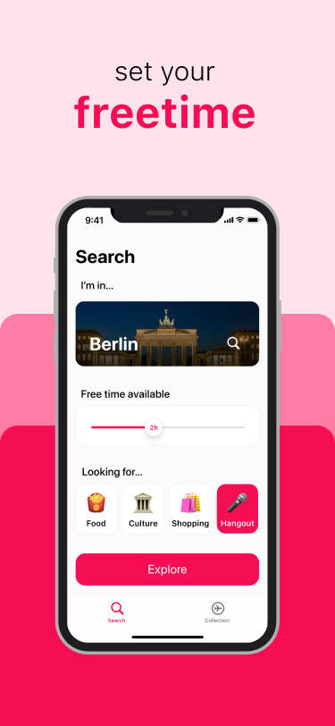 The first solution was an app that suggests activities near you, depending on how much time you have. It focused on three points: